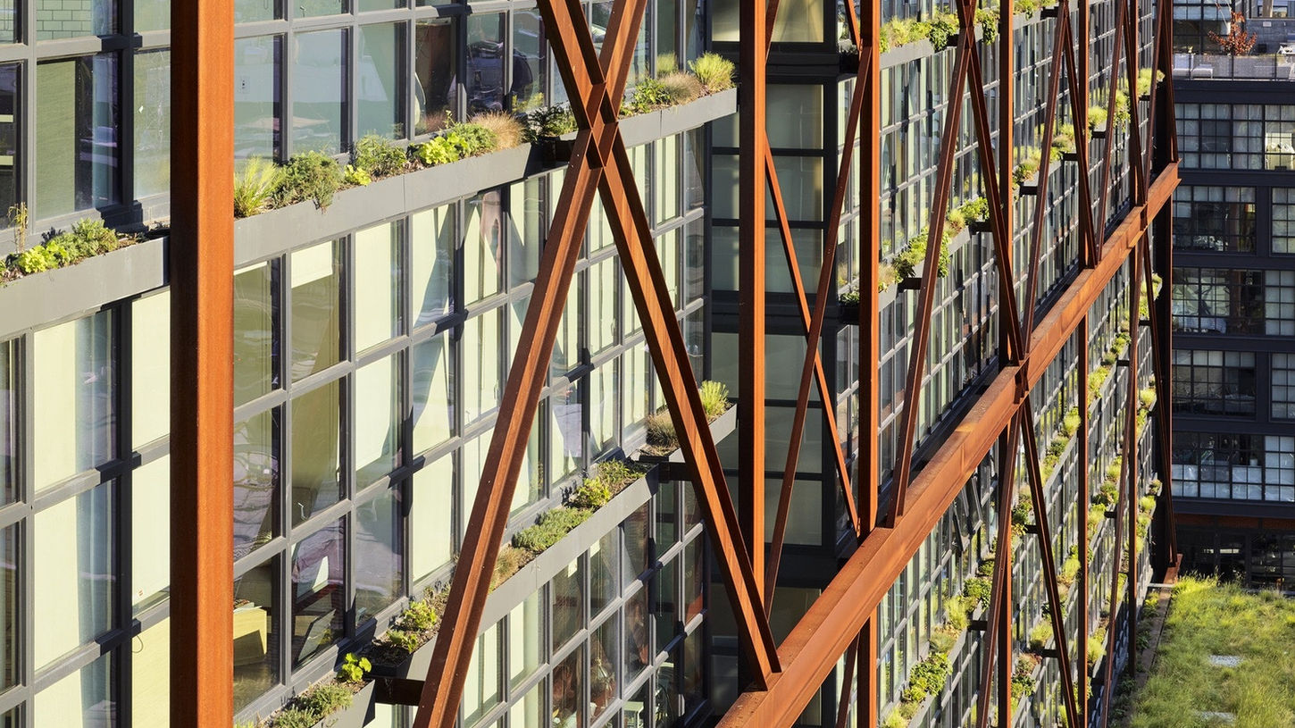 This 11-story residential complex, located in Washington DC's vibrant Shaw neighborhood, was completed by Morris Adjmi Architects in 2016. Its striking primary feature is a cross-braced Cor-ten steel exoskeleton which provides the building's lateral stability, while also shading and providing perimeter balconies for the 310 residential units inside. The glass volume sits on a masonry base which recalls the industrial heritage of the site. At street level, the large doors provide community access to restaurants, a theatre, and art studios. Brick and steel, softened with wood and greenery, bring a new life to this essential piece of the neighborhood.